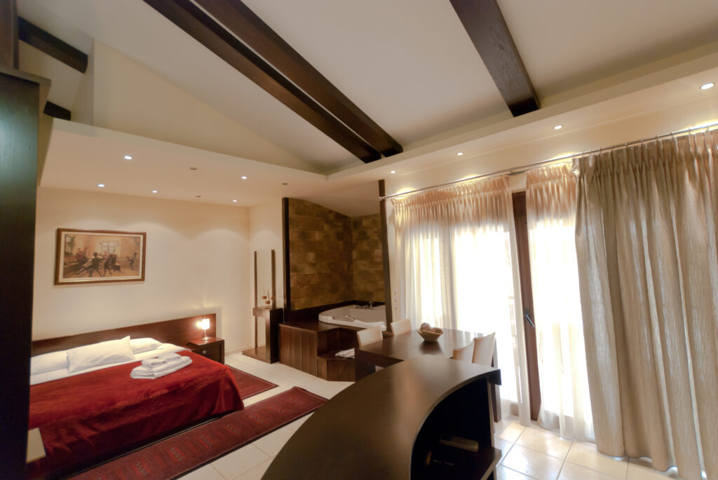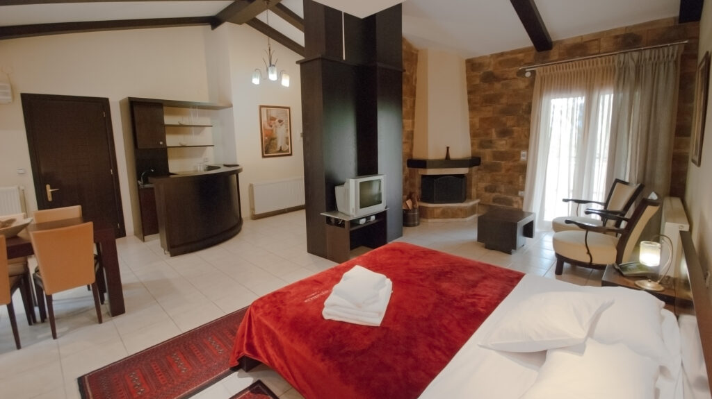 Μεγαλόπρεπη πολυτέλεια! Η μεγάλη αυτή σουίτα έχει τα πάντα: μπαρ, τραπεζαρία, διπλό Jacuzzi, δύο μπαλκόνια με θέα μπροστά και πίσω, τζάκι με σαλονάκι. Όλα αυτά μέσα στην διακριτική πολυτέλεια που ξέρουμε να προσφέρουμε, με ξεχωριστή διακόσμηση και αντίγραφα μεγάλων έργων τέχνης στους τοίχους.